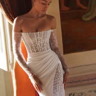 Cold-shoulder graceful dress with fitted corset top and lightly embroidered long sleeves. The fine floral applications asymmetrically positioned over the hips, waist and neckline create ease for the design, while a detachable sleek overskirt featuring full-length slit on the left is a touch of timeless elegance.